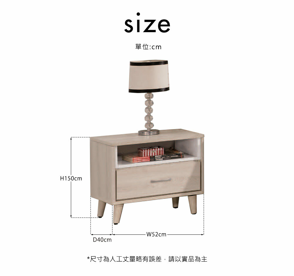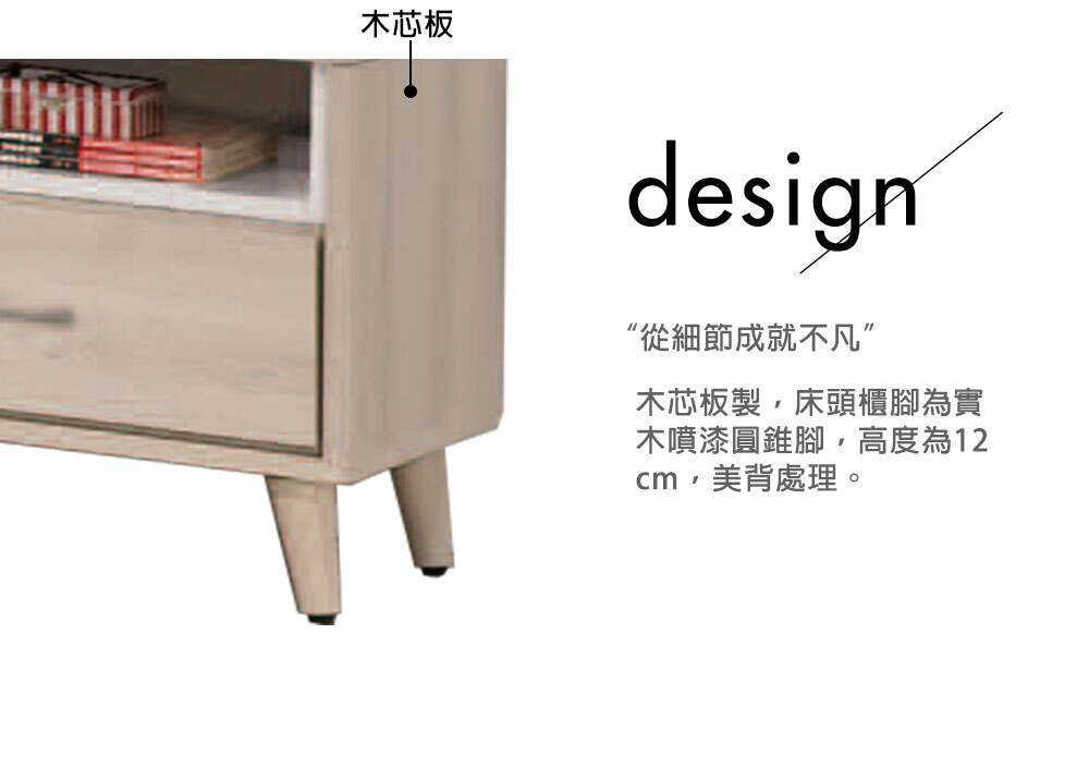 床頭櫃腳為實木噴漆圓錐腳,高度為12公分