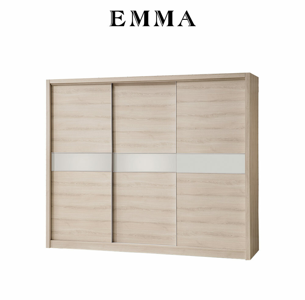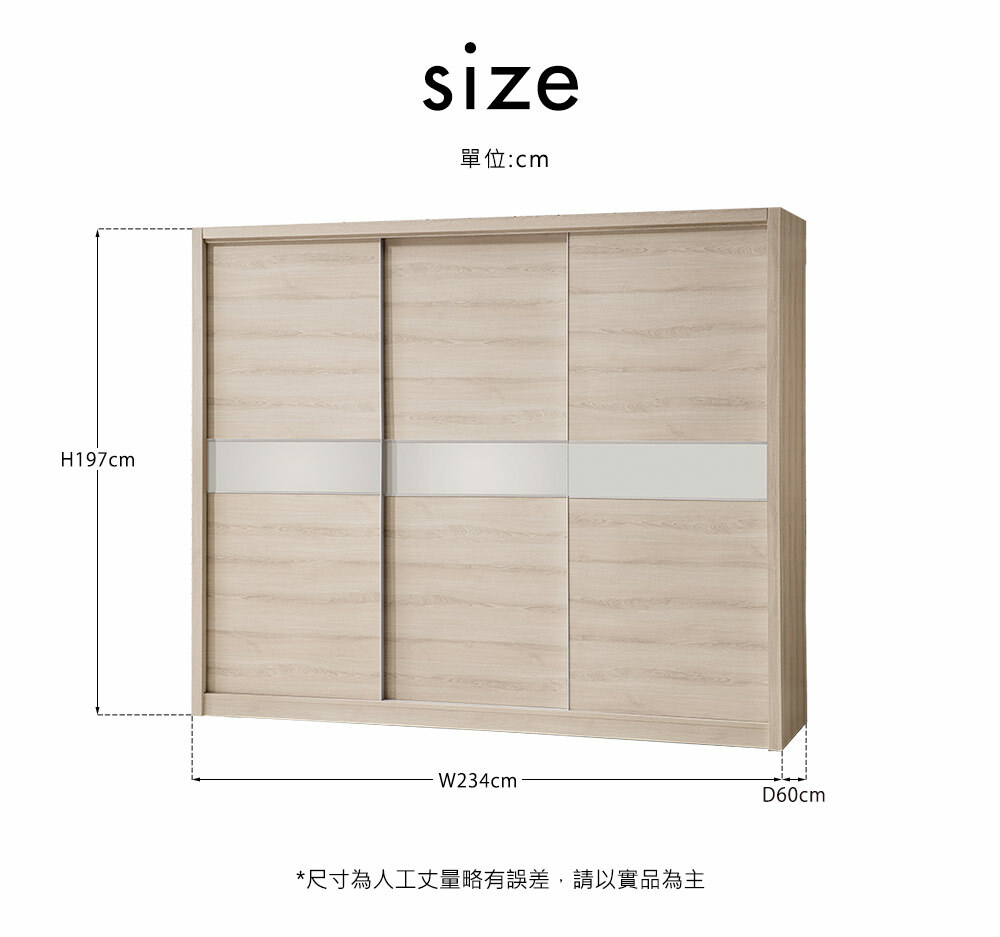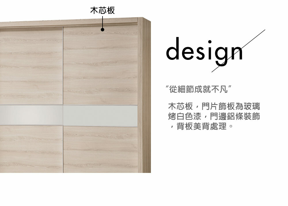 衣櫃門片飾板為玻璃烤白色漆,門邊鋁條裝飾