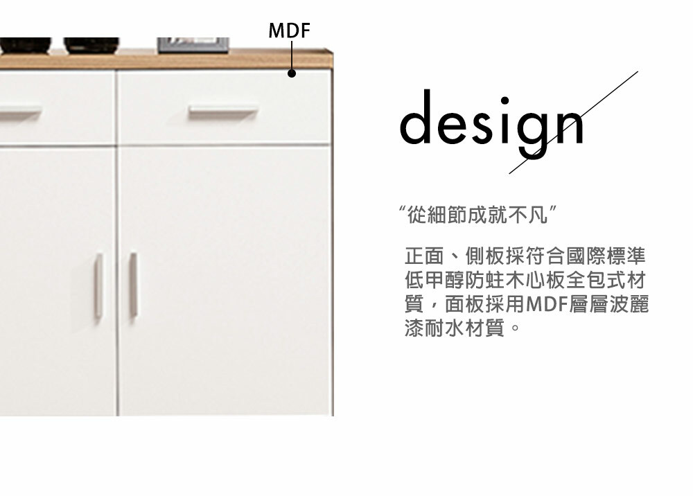 正面、側板採用符合國際標準低甲醇防蛀木心板全包式材質:。