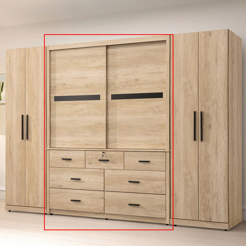 尺寸:寬152x深58x高200(公分)材質:採用台灣低甲醛木芯板,正面側面浮雕耐磨處理手把: 黑色鋁製烤漆,後鈕: 緩衝油壓鉸鍊,衣櫃抽屜使用三節滑軌背板: 釘附式美背處理其他說明:僅販售標示家具,不包含其他飾品