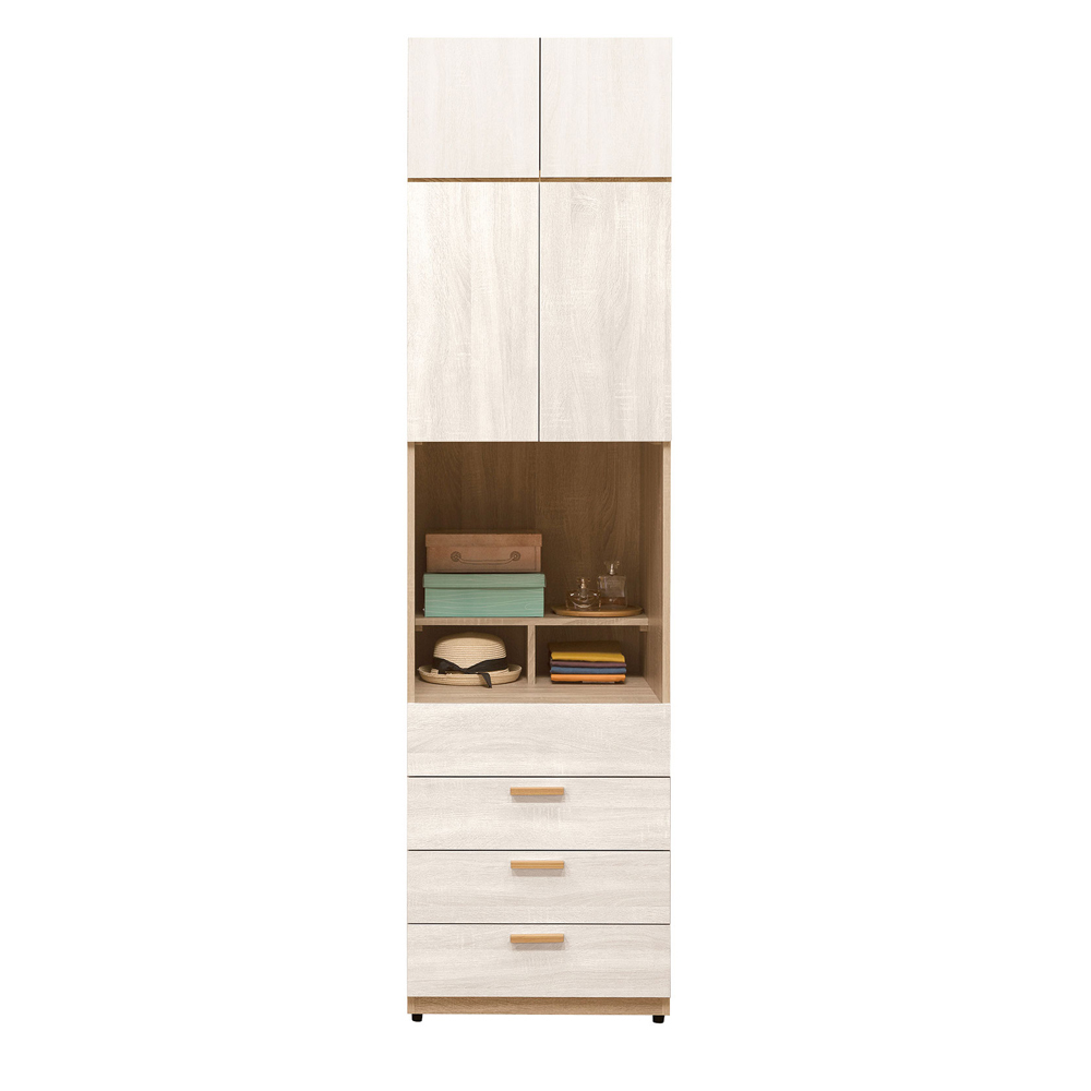 尺寸:寬60x深60x高237(公分)材質:正面、側面、面板、採用 MIT 防蛀環保低甲醛木心板,表面最新技術白橡木紋同調立體浮雕耐磨處理,比擬鋼刷風化木觸感,原切橡木與橡木洗白配色,營造明亮清新氛圍、實木材質手把、妝點清新風格。底板: 加厚為5mm 高級夾板貼皮抽屜: 採用 MIT 鋼珠滑軌後鈕: 時尚黑鈦金色 MIT 油壓緩衝後鈕背板: 採崁入式美背處理其他說明:僅販售標示家具,不包含其他飾品