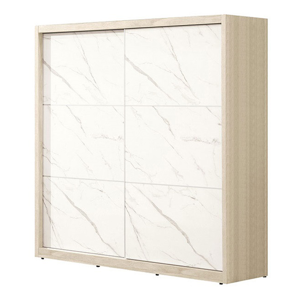 床台為專利五金木心板材質,6尺推門衣櫃門片採用魚肚白大理石耐磨美那皿面板 .