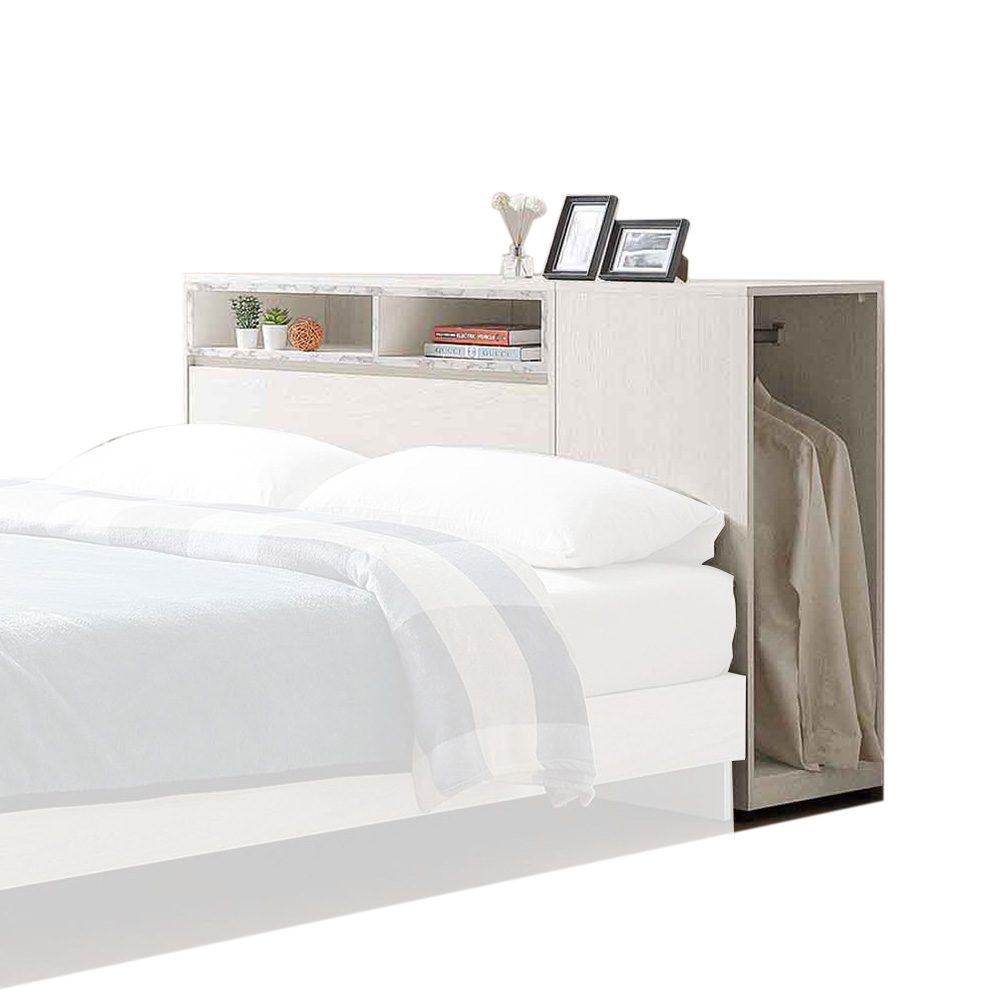 正面 . 側板 . 桌面採用國際低甲醛木心板專利技術耐磨木紋同調浮雕壓紋 . 觸感猶如實木桌面採用木心板大理石美耐皿,側板採用木心板曲線弧形加工(3.5尺床頭箱+1.5尺衣櫃下座) (可左右自由擺放) (3.5尺床頭箱掀蓋下緣55cm)