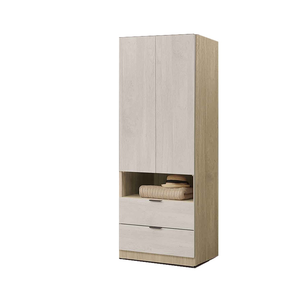 材質:正面、側板採用超耐磨木心板,面板採用仿石紋耐皿面 板,正面、面板採系統式 1.5mm 厚 ABS 材質封邊處理 斗櫃、衣櫃抽屜底板為 5mm