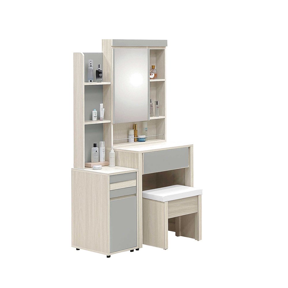 材質:正面 . 側面 . 面板為木心板 木心板採用符合標準低甲醛 . 耐磨皮 . 耐水材質(2尺開門鏡台(含椅)+鏡台立櫃)]