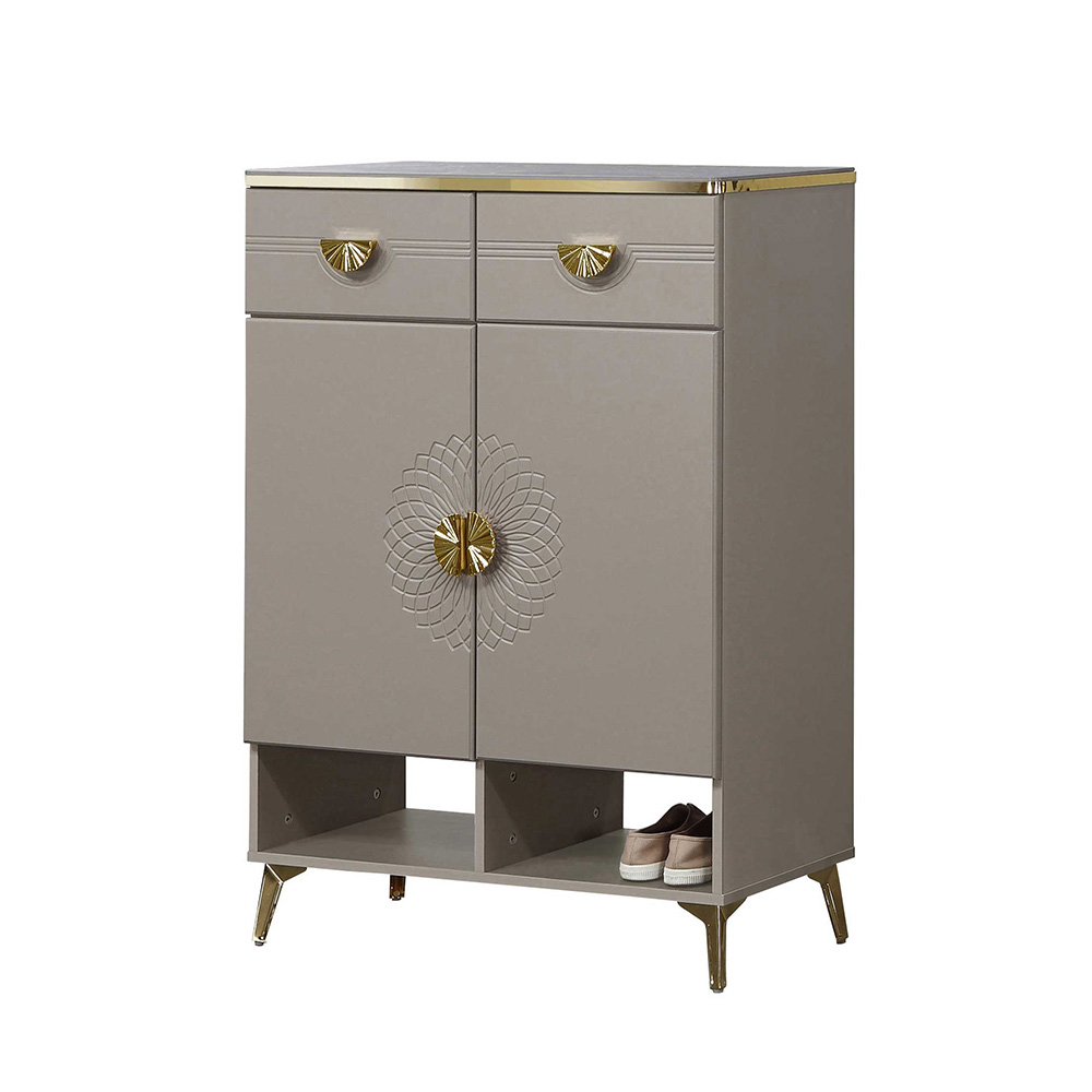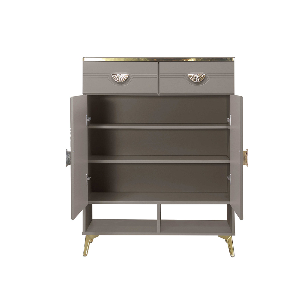 材質:高級 MDF 打造 + 桌面 5mm 亮面岩板 +11cm 不鏽鋼電鍍金腳 /( 岩板特性:高強度 . 耐磨耐刮 . 耐高溫 . 易清潔 ) 抽屜採高級鋼珠滑軌 門片採油壓後鈕緩衝設計美背處理