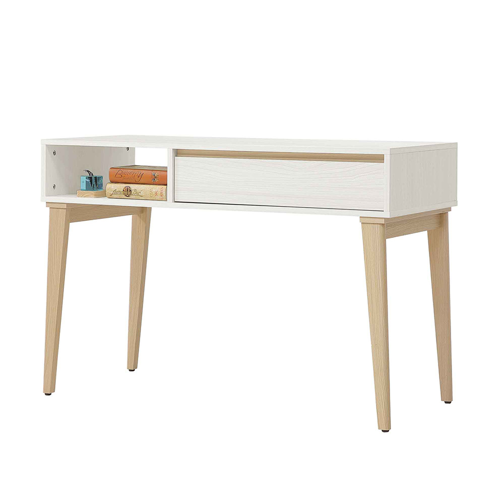 材質:正面 . 側板 . 桌面採用國際低甲醛木心板 表面採專利技術耐磨木紋同調浮雕壓紋 . 觸感猶如實木 側板採用木心板曲線弧形加工一體成型 採用 PU. 耐磨塗裝 抽屜採用三截式快拆鋼珠滑軌 後鈕採用油壓緩衝後鈕 採用實木製成弧度支撐實木腳柱,腳高 15.5cm,下緣高度 12cm 實木腳柱下之腳粒全為可調整式腳粒 採用美背處理