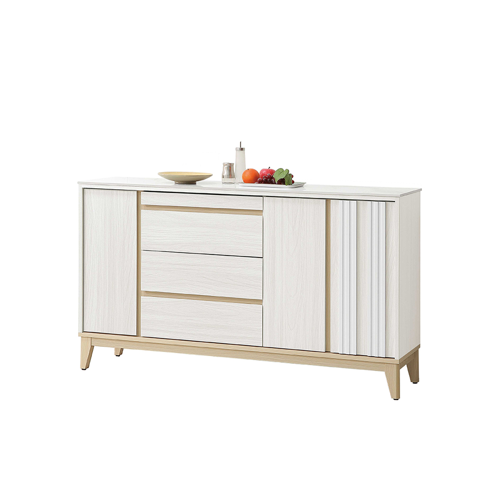 材質:正面 . 側板 . 桌面採用國際低甲醛木心板 玻璃採用木心板 +5mm 長虹強化玻璃 採用 9mmMDF 材質 CNC 加工成型四層噴漆 採用 PU. 耐磨塗裝 亮面岩板 1.2cm( 岩板特性 : 高強度 . 耐磨耐刮 . 耐高溫 . 易清潔 ) 抽屜採用三截式快拆鋼珠滑軌 後鈕採用不鏽鋼油壓緩衝後鈕採用實木製成弧度支撐實木腳柱,腳高 15.5cm,下緣高度 12cm 實木腳柱下之腳粒全為可調整式腳粒 採用美背處理