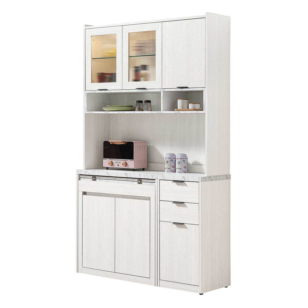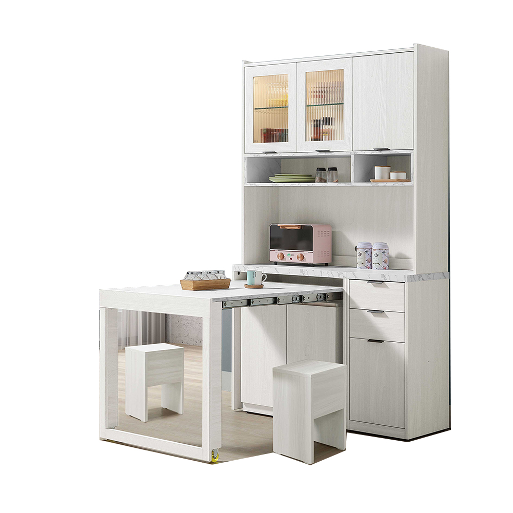 材質:正面 . 側板 . 桌面採用國際低甲醛木心板專利技術耐磨木紋同調浮雕壓紋 . 觸感猶如實木 桌面採用木心板大理石美耐皿,側板採用木心板曲線弧形加工 餐櫃採用 5mm 長虹強化玻璃 ( 附 USB 充電式 LED 感應燈 ) 採用三截式鋼珠滑軌 採用油壓緩衝後鈕採用美背處理