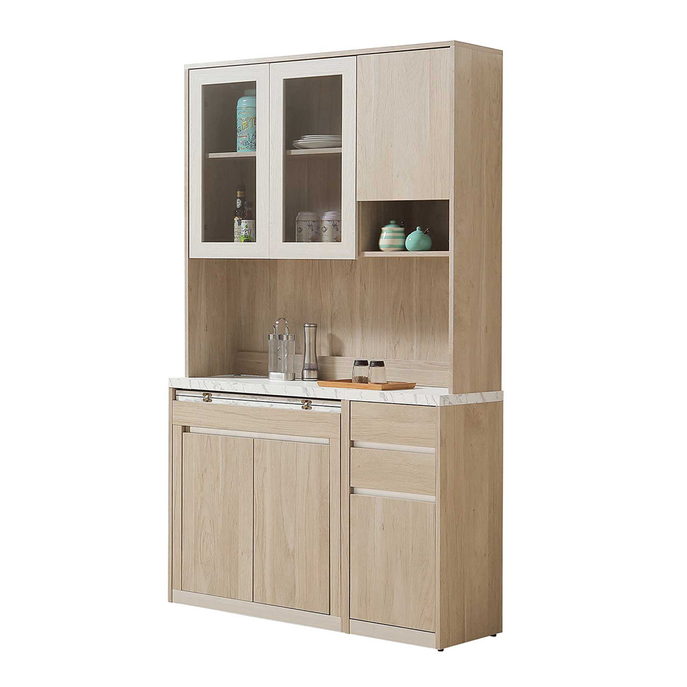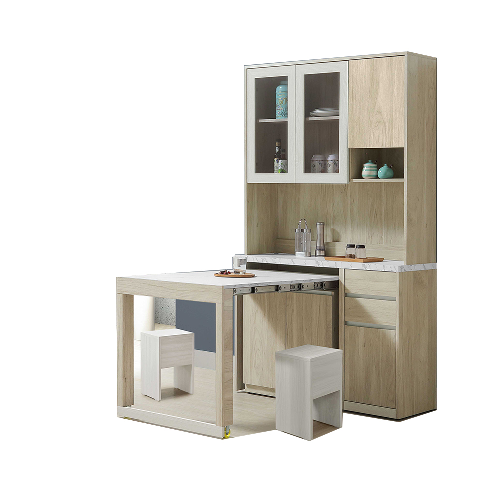 材質:正面 . 側板 . 桌面採用國際低甲醛木心板,表面採用專業技術耐磨木紋同調浮雕壓紋,觸感猶如實木, 桌面採用仿大理石紋美耐皿材質,具高溫耐刮磨之特性 餐櫃採 3mm 清玻強化玻璃 採用 PU. 耐磨塗裝 採用三截式鋼珠滑軌 採油壓緩衝鉸鏈 釘附式美背處理 釘附式美背處理