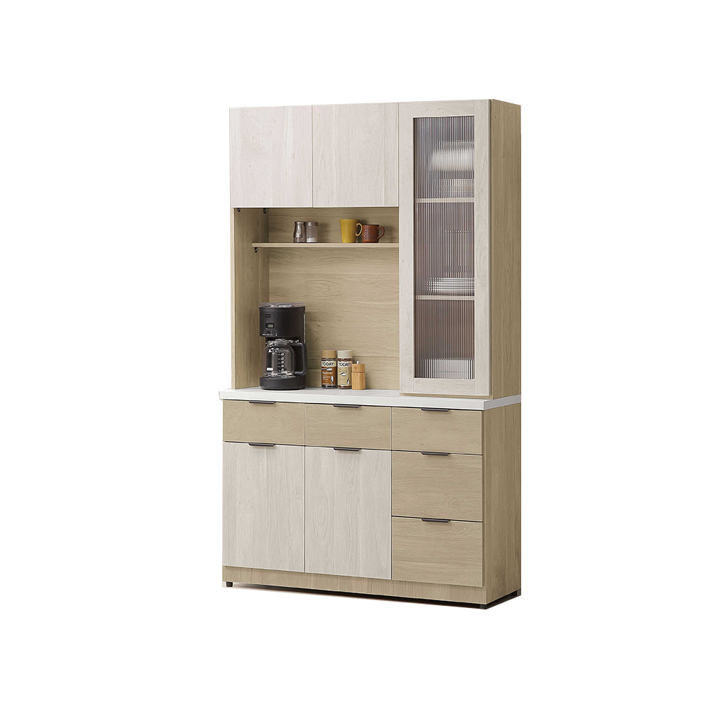 材質:正面、側板採用超耐磨木心板,面板採用仿石紋耐皿面板, 正面、面板採系統式 1.5mm 厚 ABS 材質封邊處理 餐櫃上座右邊門片為長虹 PC 板 抽屜採用高級鋼珠滑軌 門片採用高級油壓緩衝後鈕 採釘附式美背處理