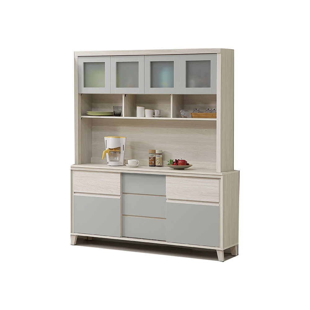材質:正面 . 側面 . 面板為木心板 木心板採用符合標準低甲醛 . 耐磨皮 . 耐水材質 腳採用實木腳,腳高 11cm 抽屜抽牆為木心板 . 抽底 1 分足夾板 抽屜採用鋼珠滑軌 開門採用油壓緩衝白鐵後鈕 餐櫃推門滑軌零故障 釘附式美背處理