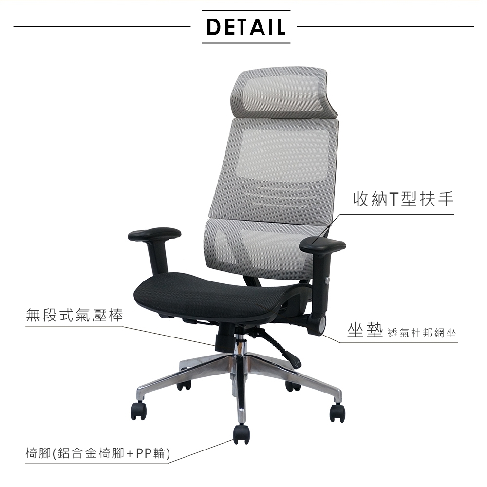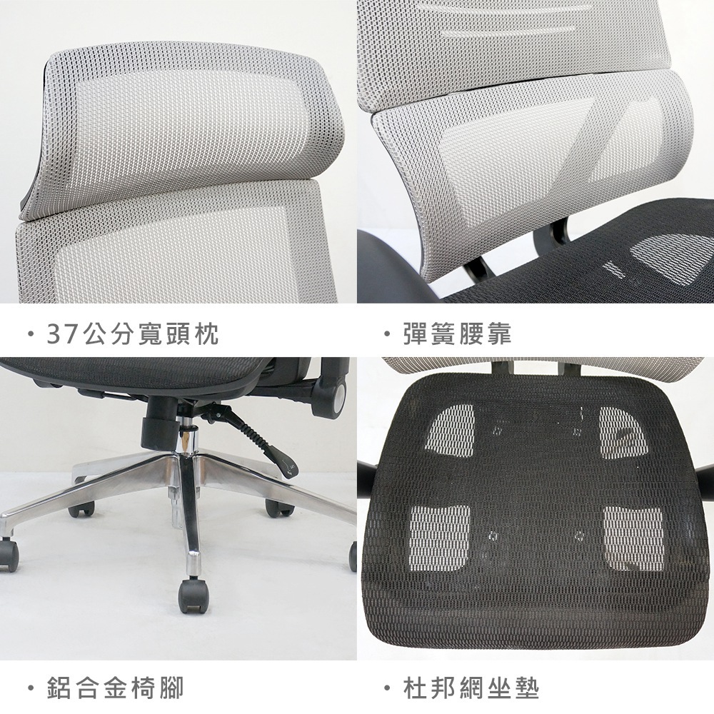材質: 37公分寬頭枕,彈簧腰靠,鋁合金椅腳、杜邦網坐墊